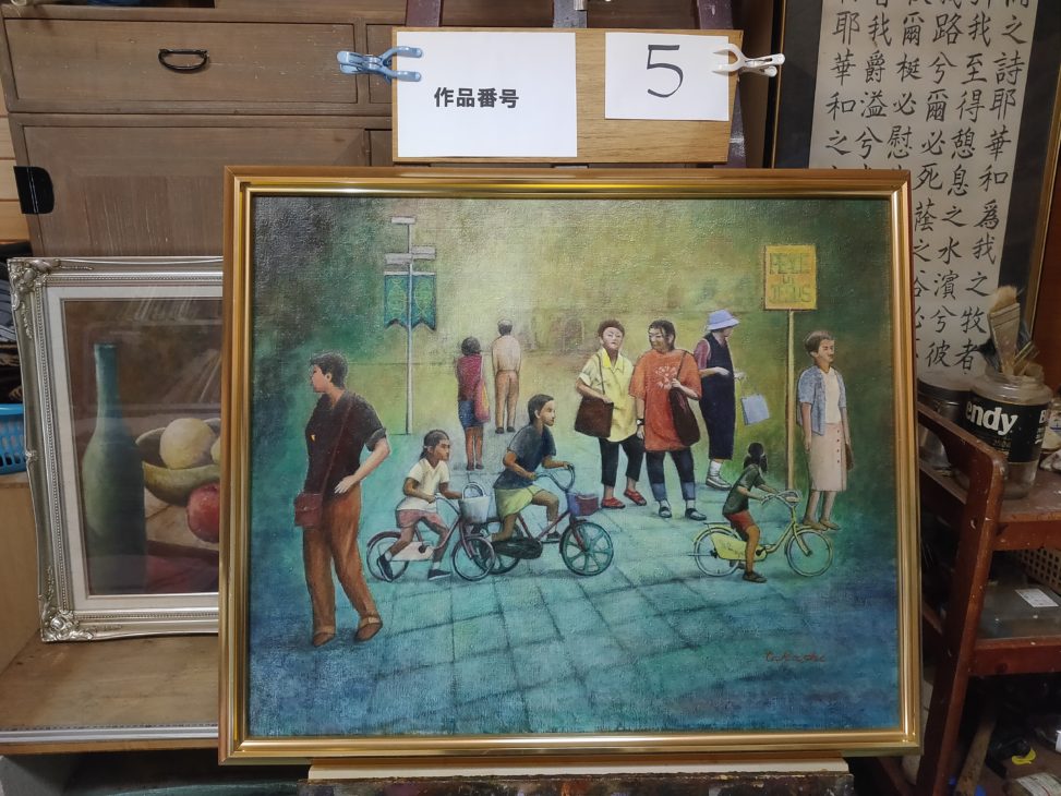 | コメント | 父の作品の中では珍しい人物が描かれた作品です。 右下の自転車に乗っている子供の頭はどうなっているのでしょうか? 軽量金属の額縁がついていてガラスは無いため軽くて扱いやすいです。 目立つ傷があります(左の男性の胸の部分) |
