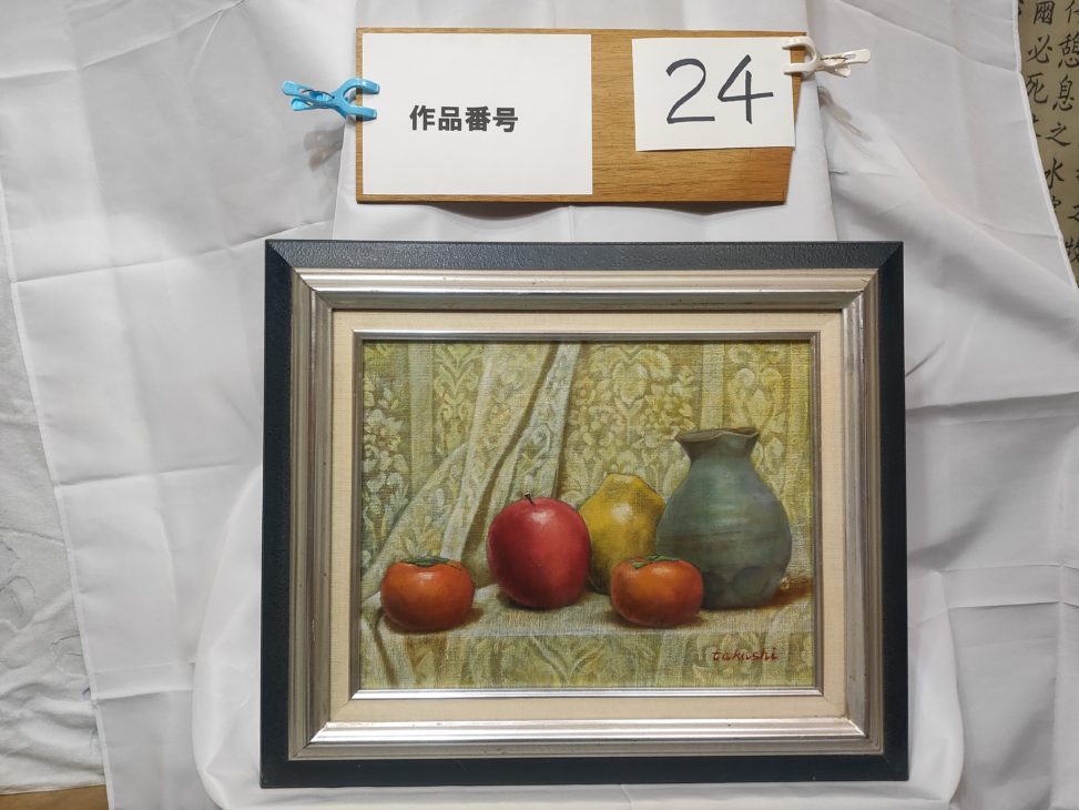 | コメント | 父の作品の中で比較的多い静物画です。 果物とつぼを描いた絵だと思いましたが、画題が「レースのカーテン」となっており、よく見るとレースの柄が繊細に描かれていることがわかります。 第10回記念アットホーム展に出品されました。 額縁には汚れが目立ちますが、作品の状態は良好です。 |
