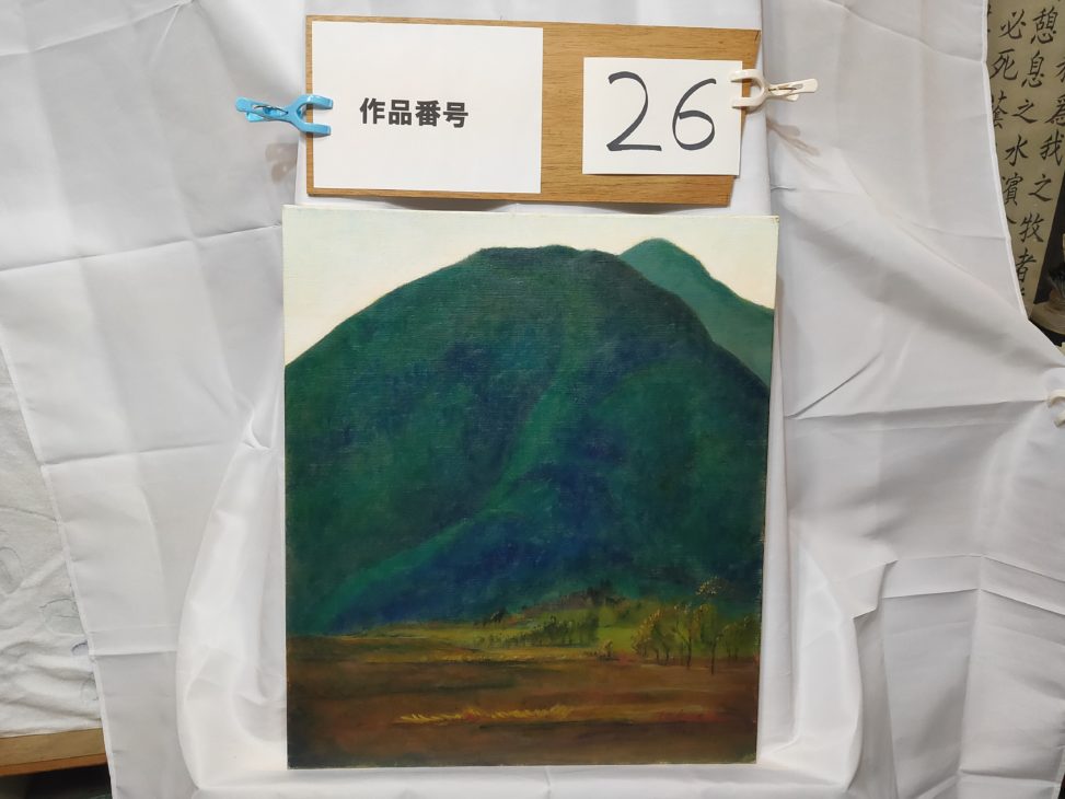 | コメント | 風景画です。 武石から見える山のようです。 やけにあっさりした作品ですが、サインがあるので完成品です。 若干傷がありますがまだいいほうです。 |
