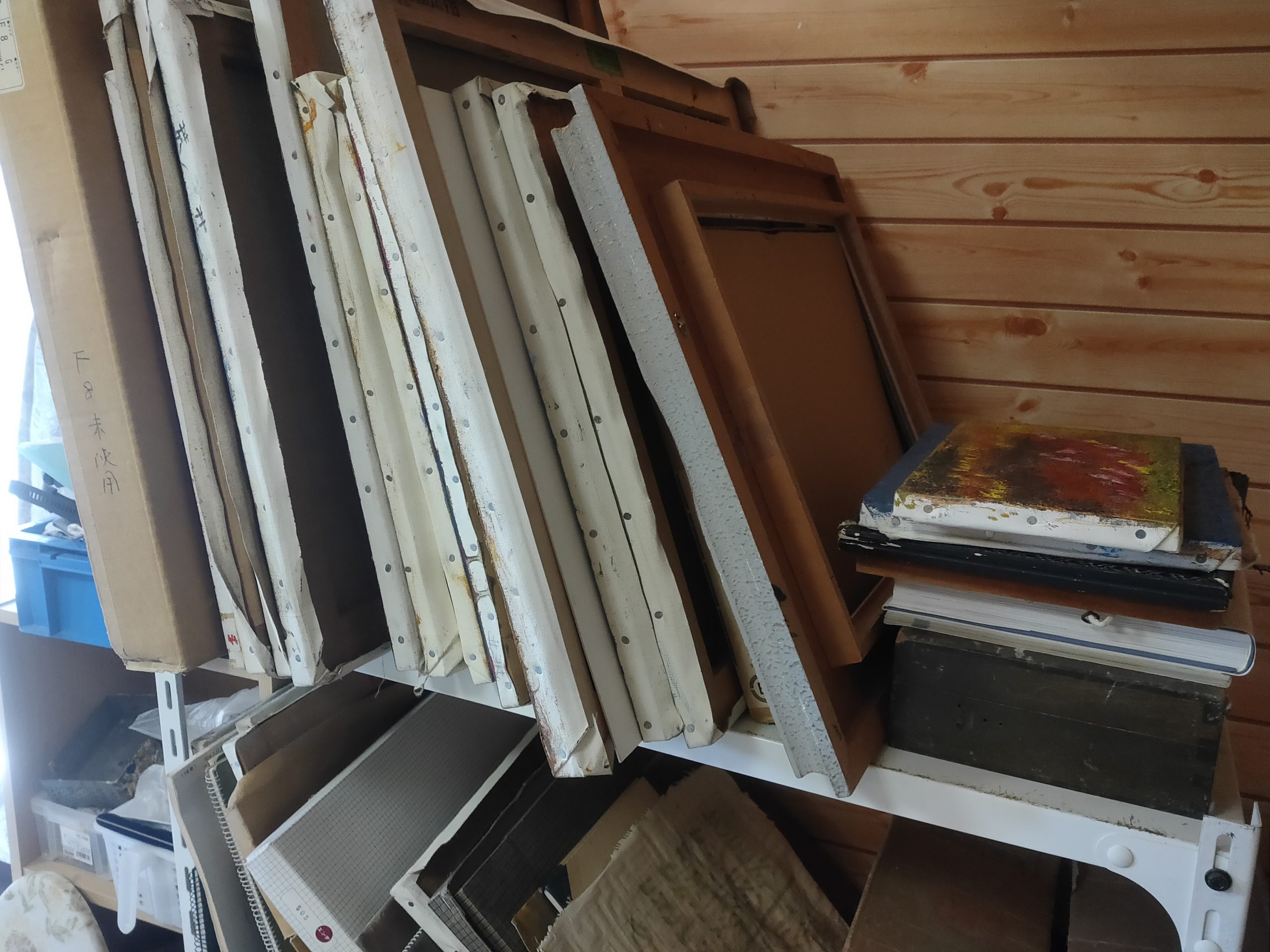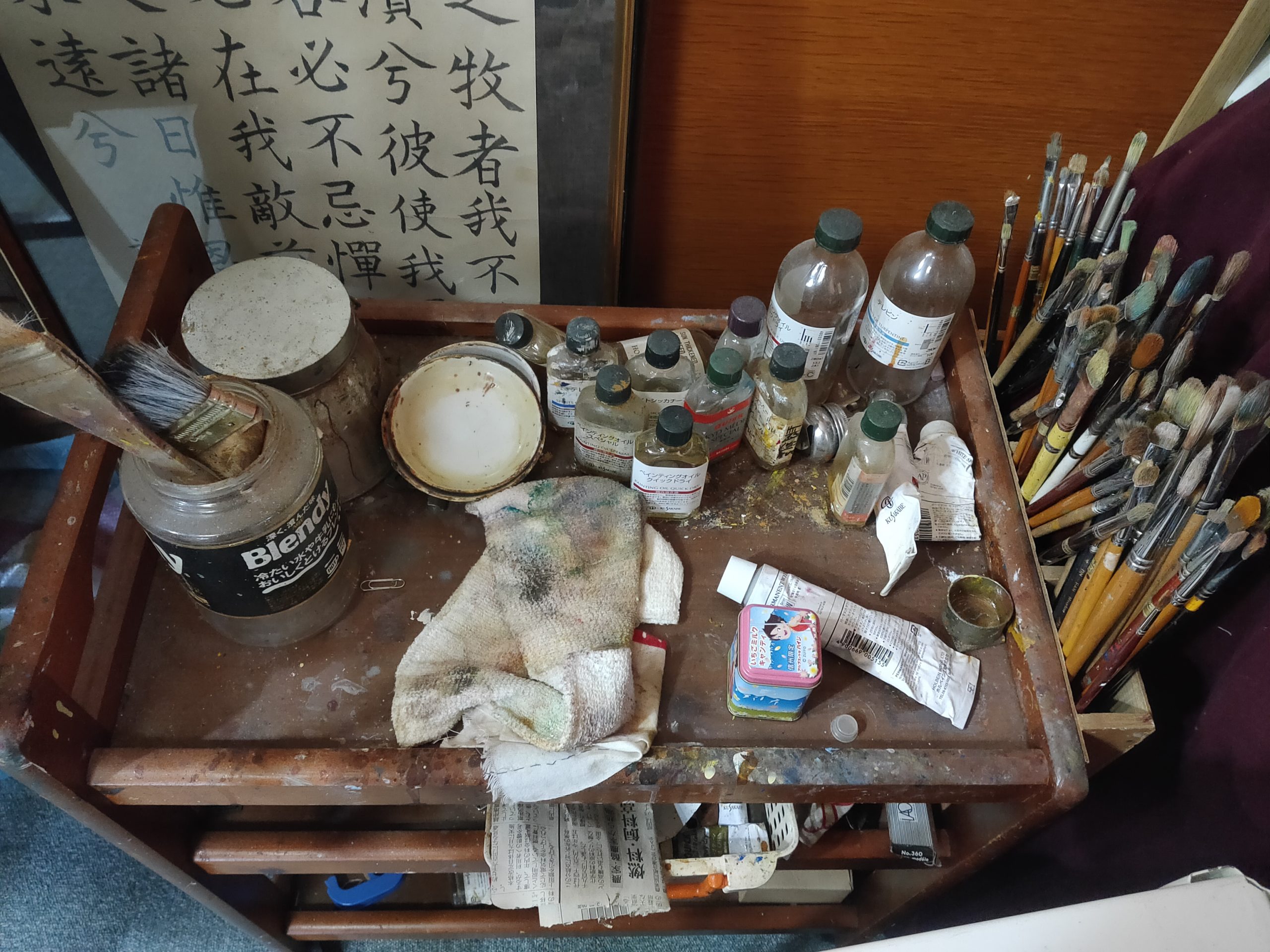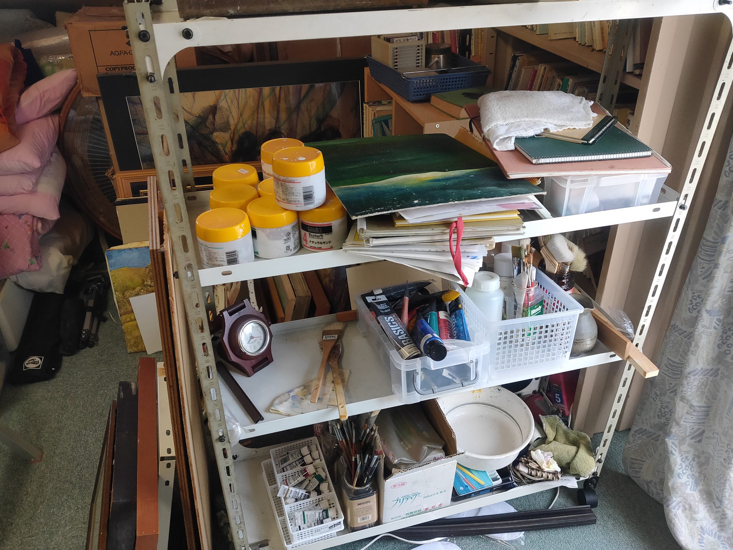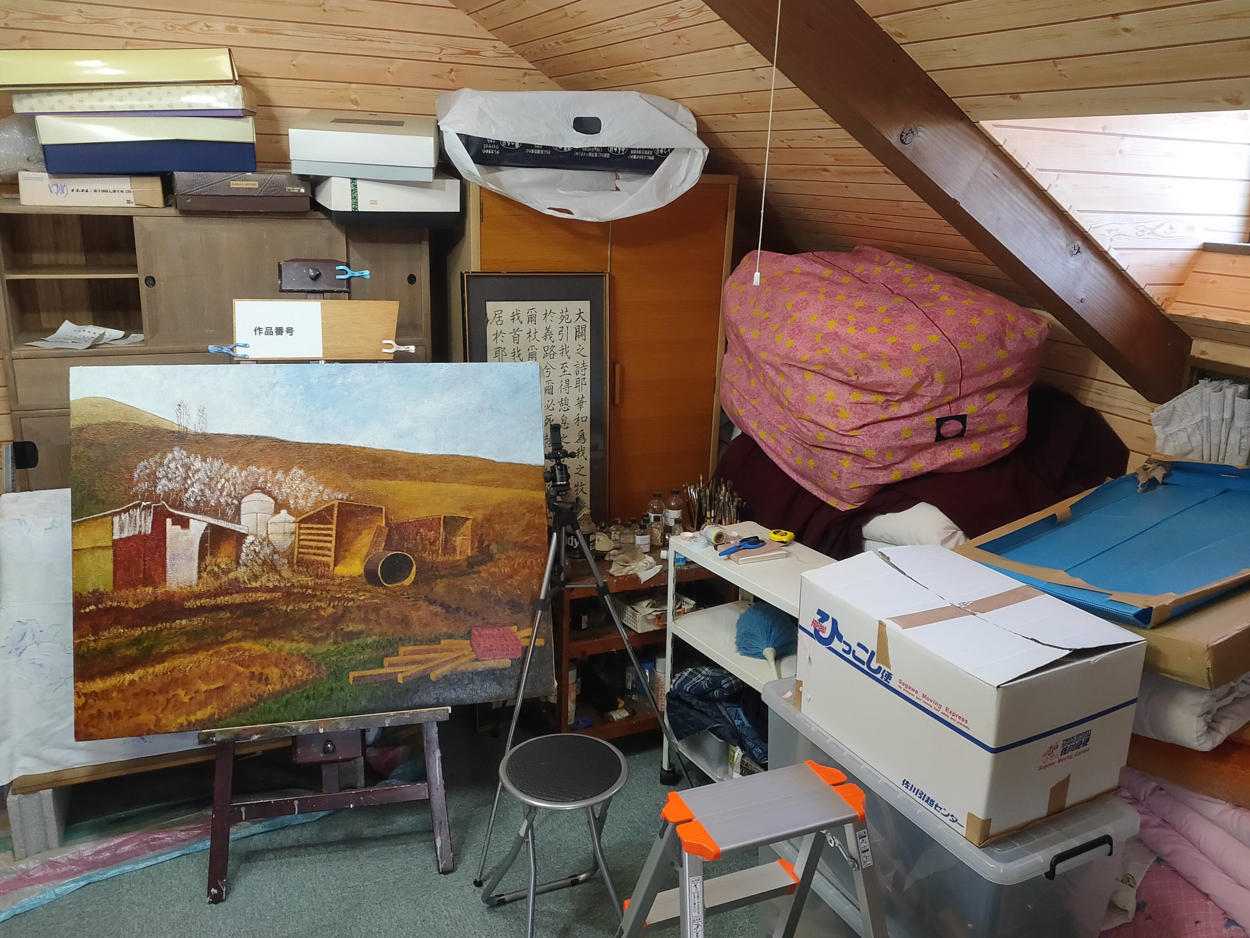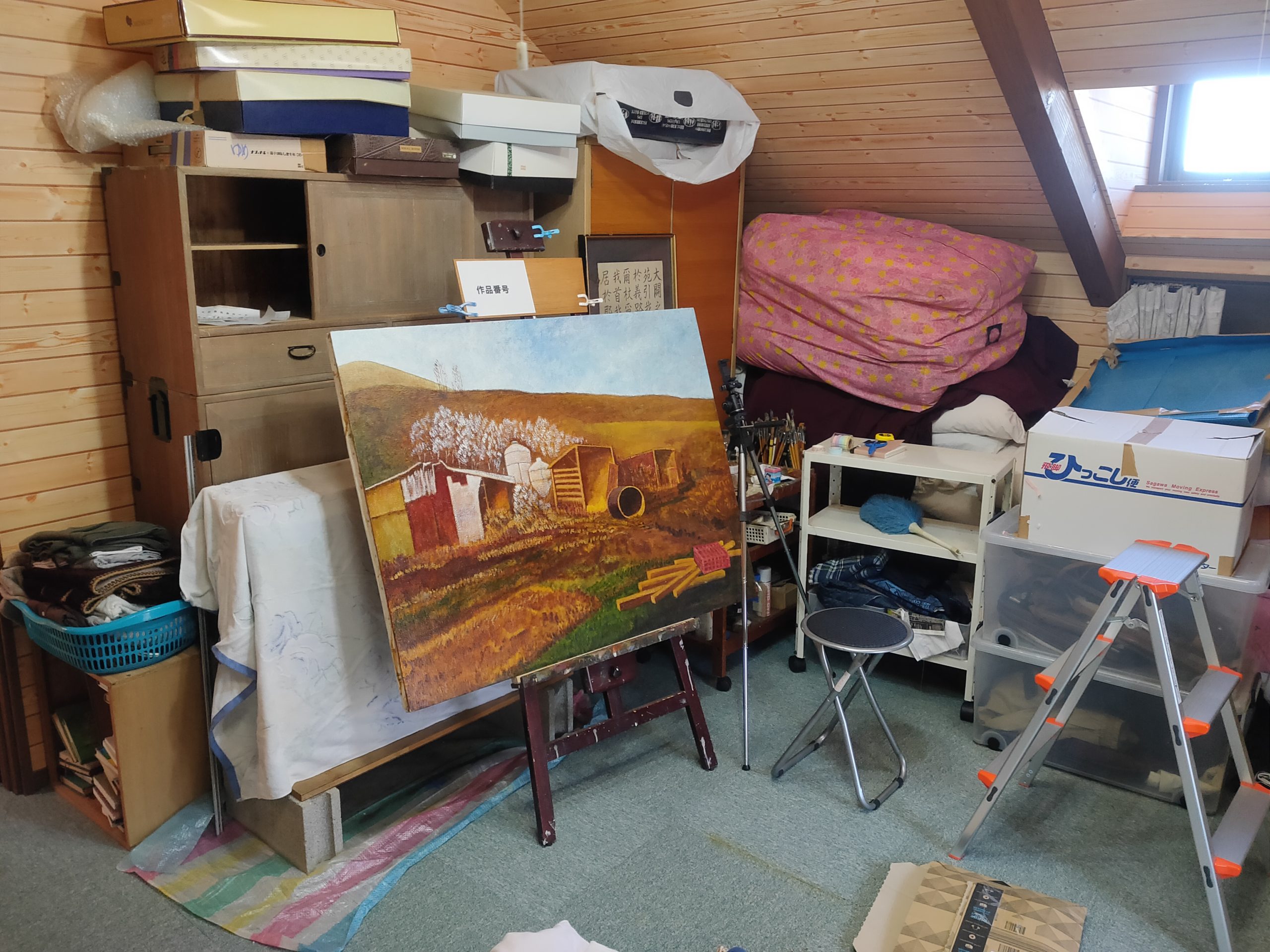 現在はだいぶ整理してしまいましたが、現役当時は足の踏み場もないような状態でした。ここで油絵を描いたり縫製をしたりしていました。