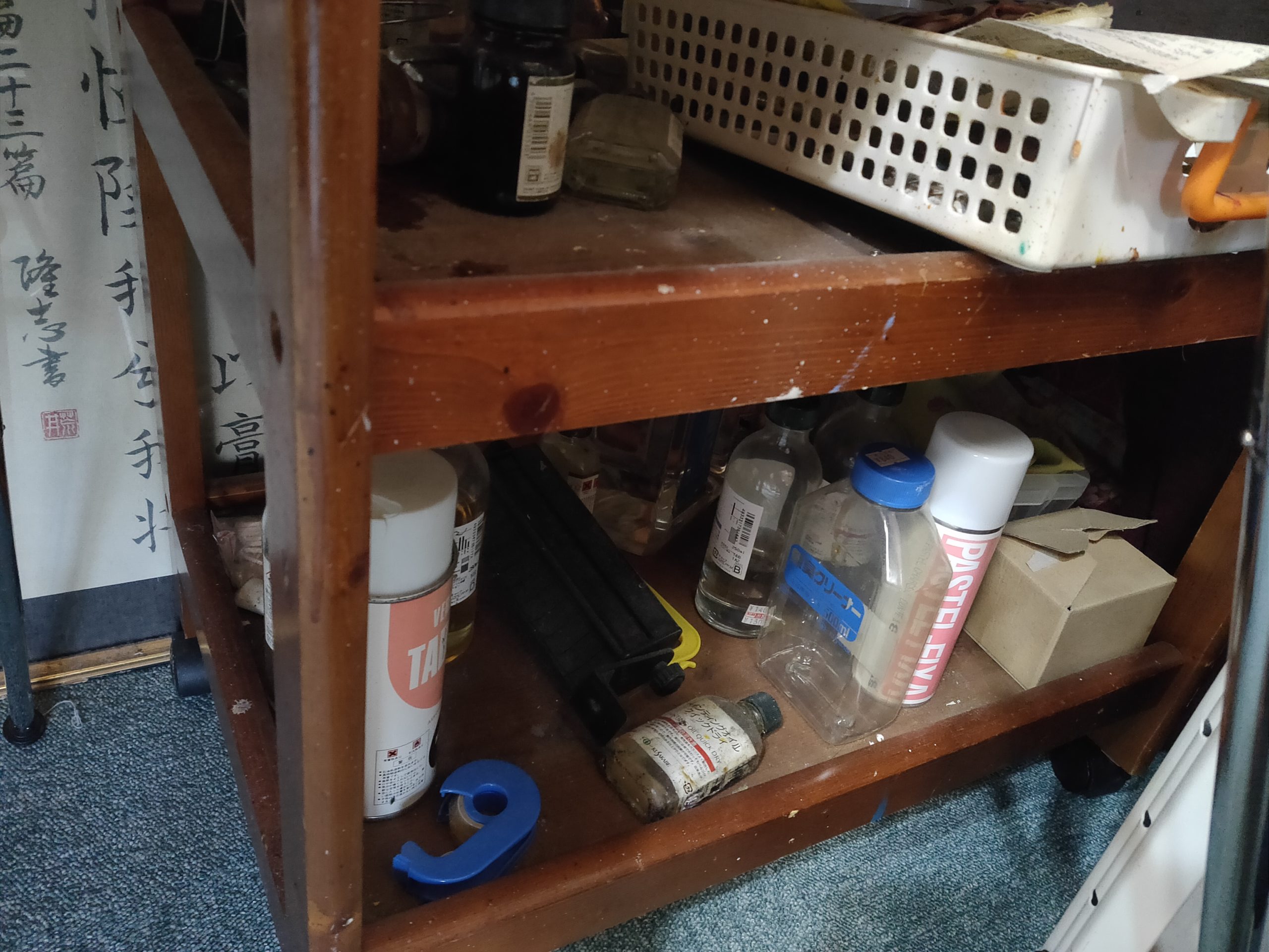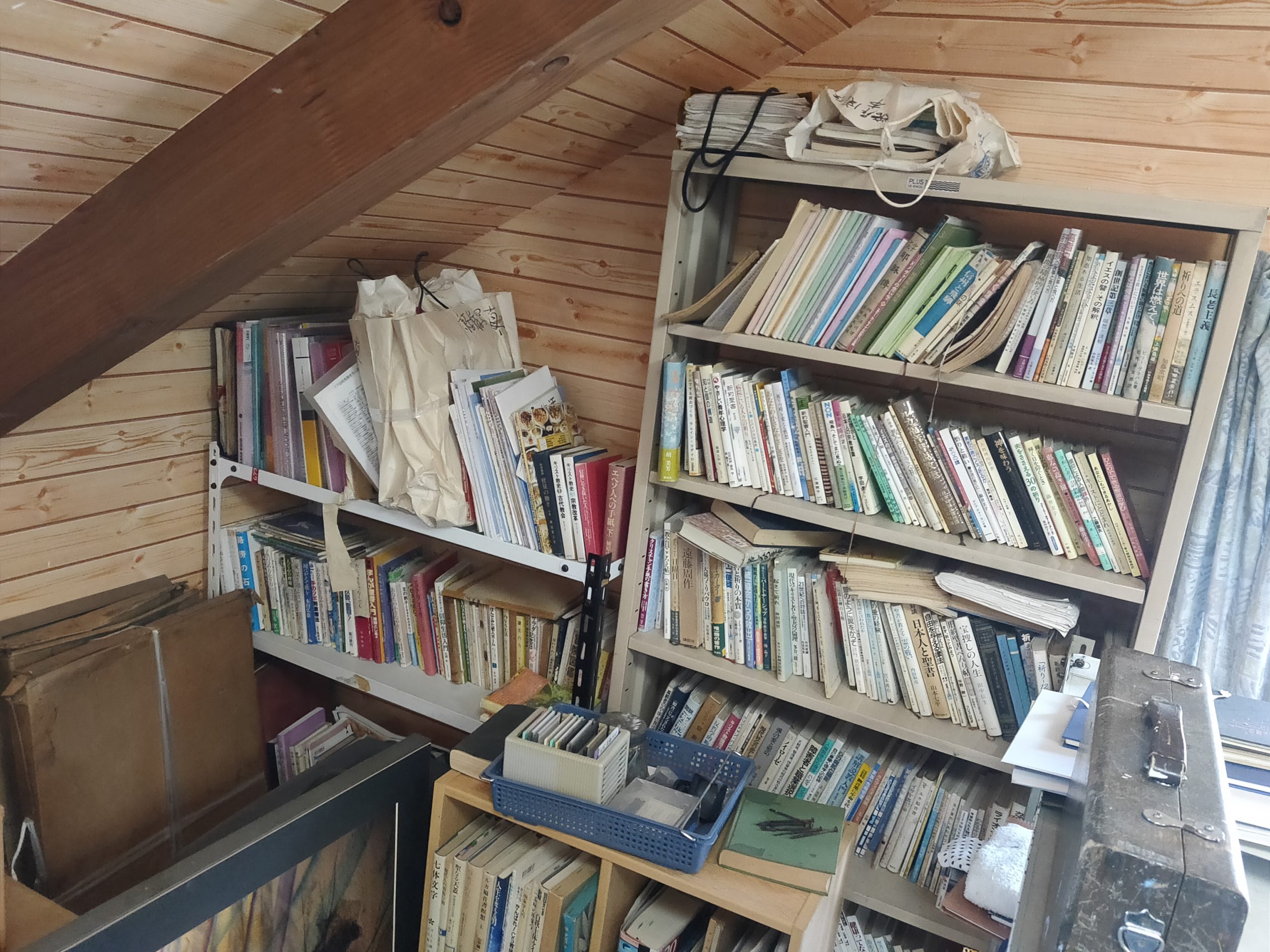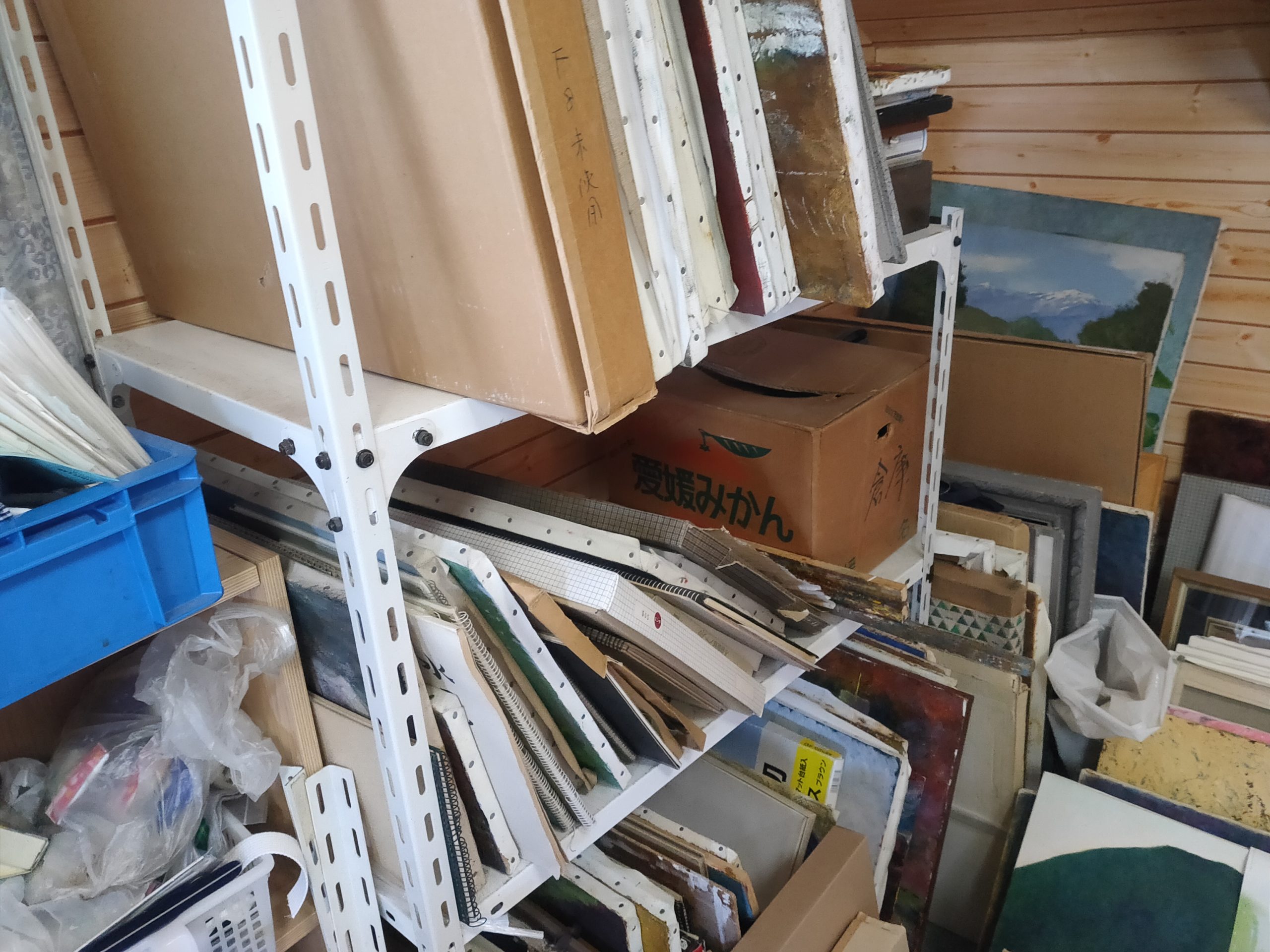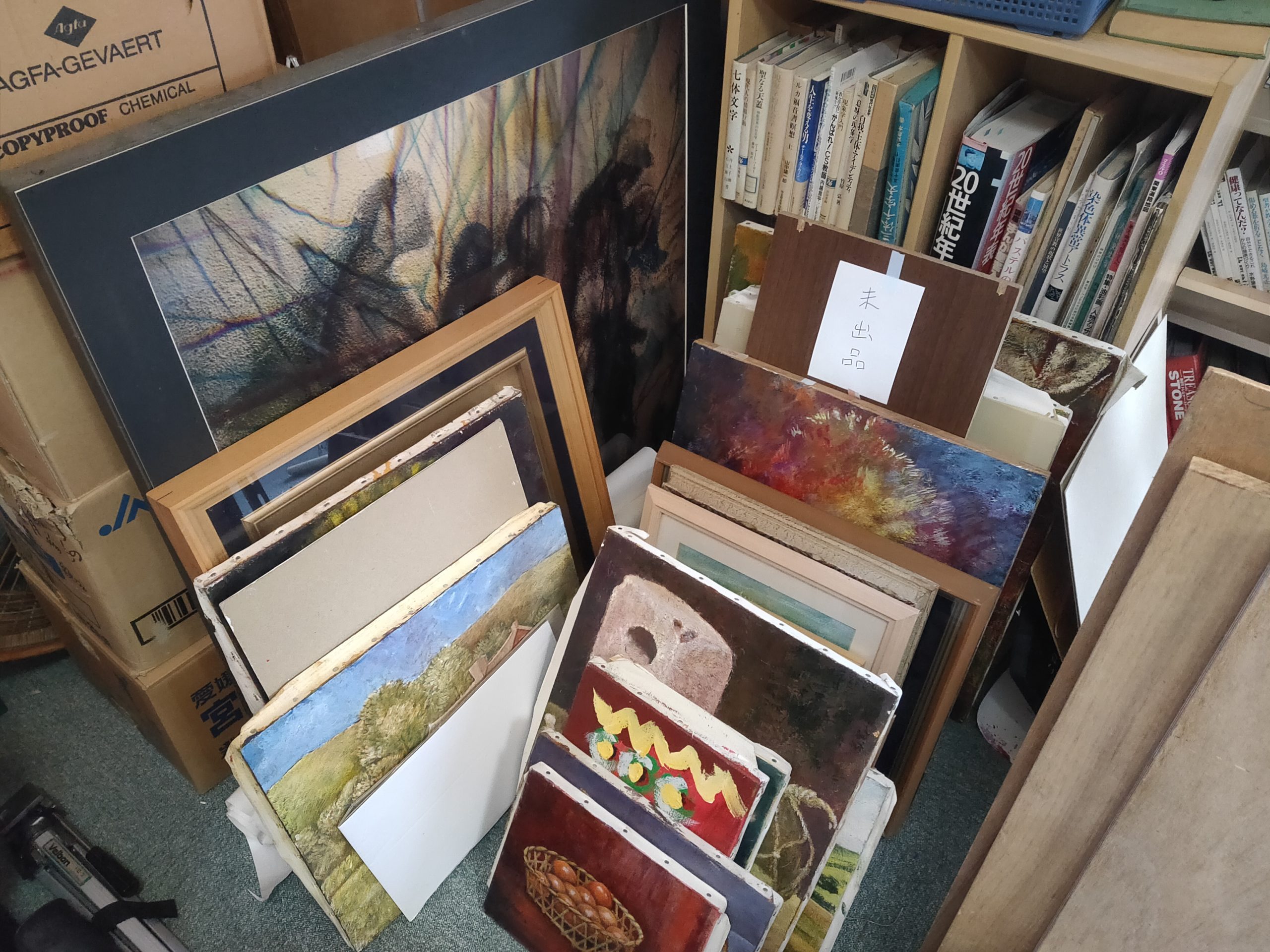 現在はだいぶ整理してしまいましたが、現役当時は足の踏み場もないような状態でした。ここで油絵を描いたり縫製をしたりしていました。